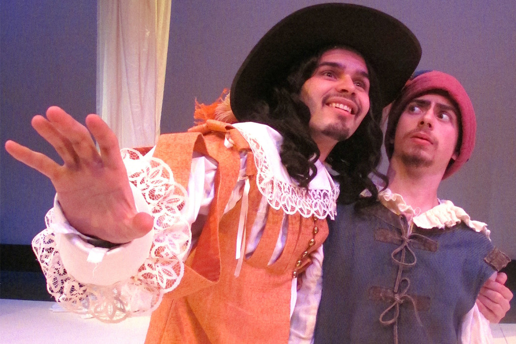 Tall, dashing Doronte (Drew Gripe), the title character, has just returned from the wars against those foul Germans. Or so he says. On his first day back in Paris, he contracts with an inventive urchin named Cliton (scene-stealing Tom Vazquez), who wears a sign reading “Rent Me” around his neck. Familiar with the city, Cliton knows the way to the elegant Tuileries Gardens, where Doronte meets two smashing lovelies, Clarice (Noelle Killius) and Lucrece (Brittany Fayle). The two damsels don’t look too much like each other, as Lucrece is taller and has red hair. Audiences used to comedy from any century immediately recognize that the similarity of their names is an invitation to trouble. Even Doronte can’t keep them straight.
