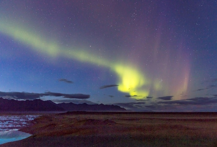 A deep purple sky with yellow Northern Lights over a grassy plane.