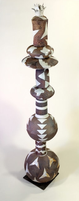 Over the years, she’s created a bunch of totems, in which ceramics are mounted on a steel post. The works at Edgewood demonstrate how she plays with this format. “Totem No. 8” encompasses figures at its top, seven ceramic segments, patterns such as diamonds and squares. “Totem No. 7” is smaller but still a fine artwork. And “Totem No. 5” has its own identity, helping to make a larger point: Demuth’s ability to avoid repetition in her totems.