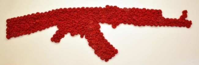 Mary Giehl’s “The Question is Why,” a large fiber work employing cotton thread and insect pins, approximates the shape of an AK47. Text accompanying the piece states that this weapon is used around the world, in the killing of around 250,000 people per year.