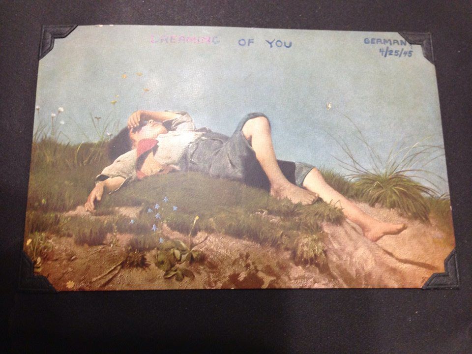 The postcard is of a boy on a hill, and he’s apparently sleeping. It seems to me that he’s covering, shielding his eyes from the sun, which is not purposefully shown. A shadow covers the boy’s eyes.