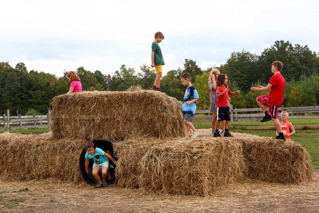 Children climb on a hale bale space at Critz Farms. (Michael Davis/Syracuse New Times)