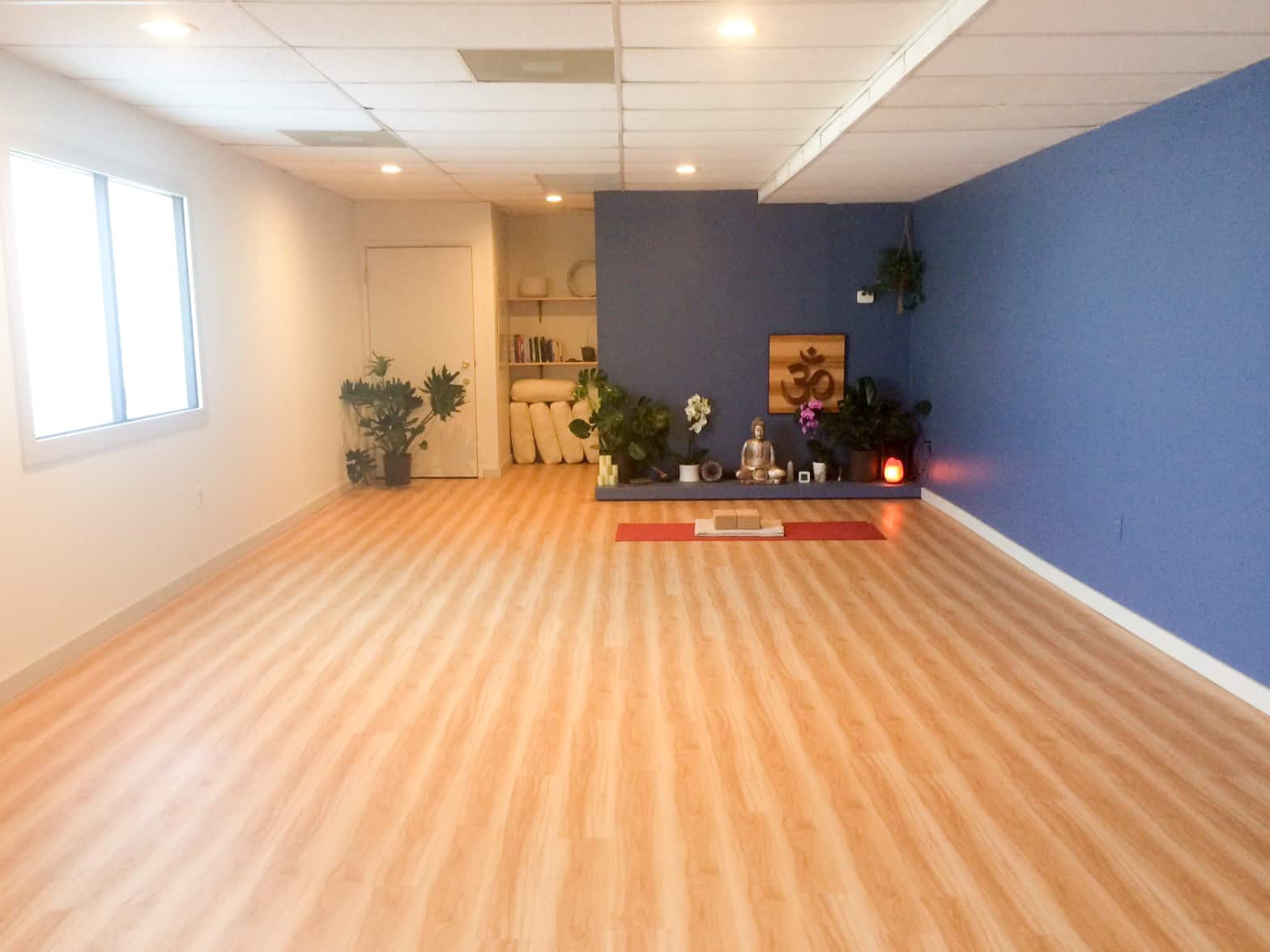 The space is modest, but that’s how McClelland wanted it. The front door leads into a small lobby, with a place for patrons to leave their shoes and a tiny shop corner displaying business and local artisan merchandise. The yoga studio fits about 16ut it people, and the windows that face the parking lot have frosted glass, adding a sense of privacy and creating a soft glow.
