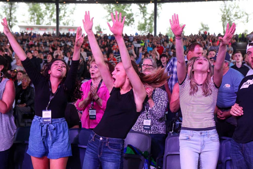 Hundreds of people were already seated inside the amphitheater by 5:40 p.m., 20 minutes before the gate’s official opening for the 7:30 p.m. free event. People lined up at tents for free T-shirts; volunteer prayer counselors stood at the ready. The crowd, predominantly white, included dozens of people in wheelchairs and dozens of people pushing babies in strollers. Several people wore T-shirts with sayings including “Not today, Satan” or “Got Prayer?”