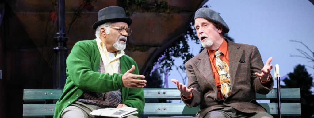 Two elderly men, one white, one black, sit on park benches in New York City. We know it’s Central Park because Tim Brown’s well-appointed set design includes one of those imposing, distinctive stone bridges, allowing joggers to pass above and painters to sketch without necessarily intruding on the action. The men are contenders rather than soul brothers.