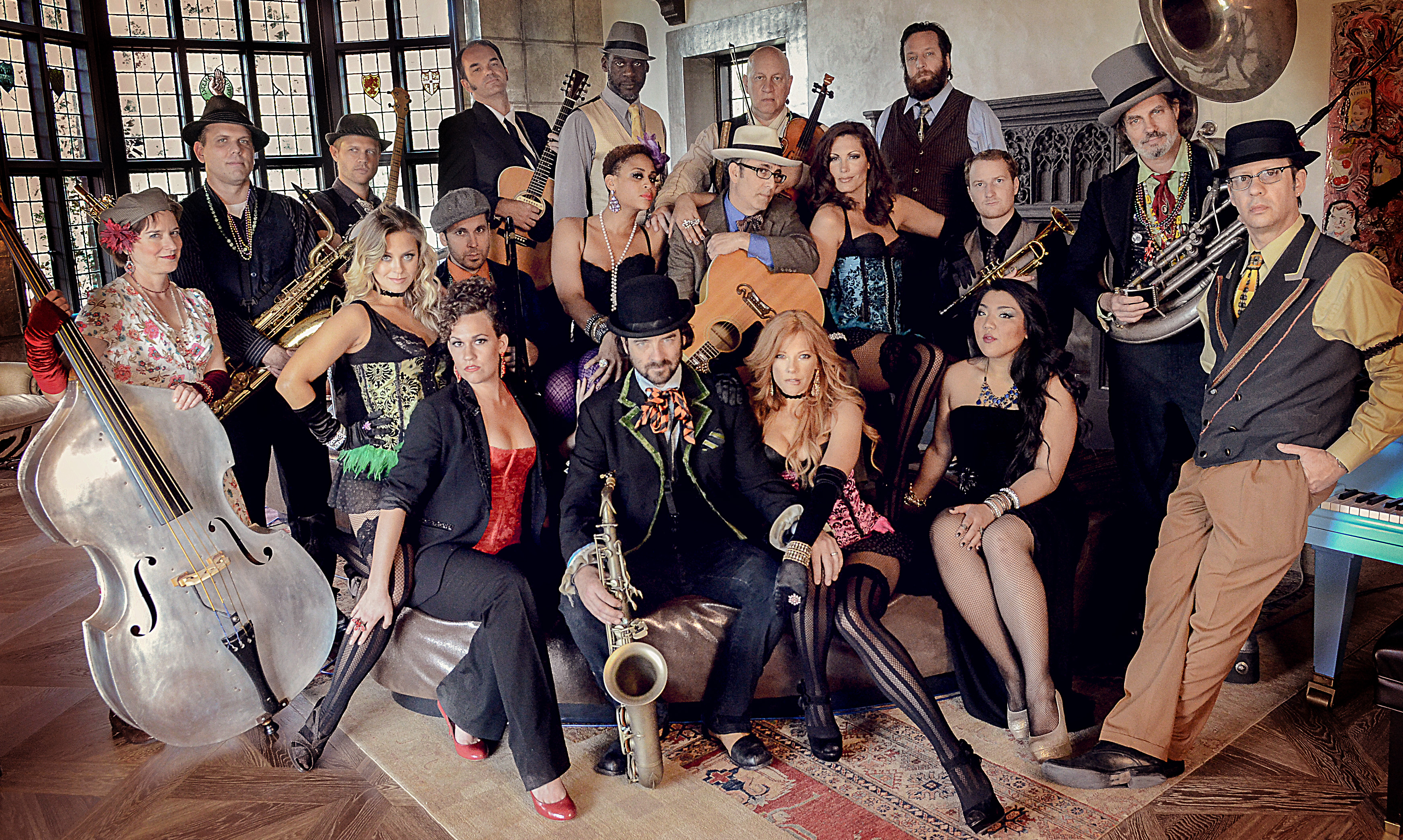 Vaud & the Villains is a 19 piece New Orleans themed orchestra and cabaret show. Based in Los Angeles, California, the group was created by actor Andy Comeau and his wife Dawn Lewis, known by their stage names, “Vaud Overstreet” and “Peaches Mahoney.” One of those bands that you “have to see live,” Vaud & the Villains electrifies audiences with an unforgettable experience. In short, “American Noir meets Moulin Rouge,” and has a child.
