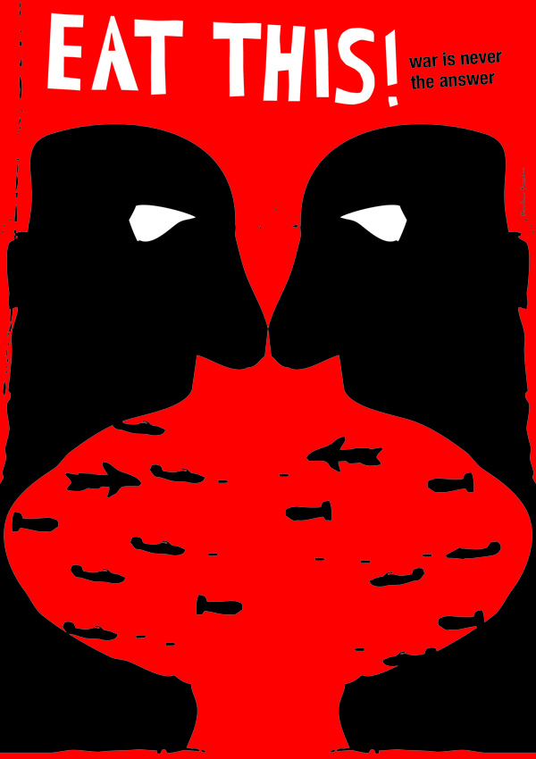 Elsewhere, “Road to Destruction” portrays a figure crushed by two walls closing in on him. “No More Wars,” one of the best works in the exhibition, depicts two hands, one holding a coffin and the other a dead dove.