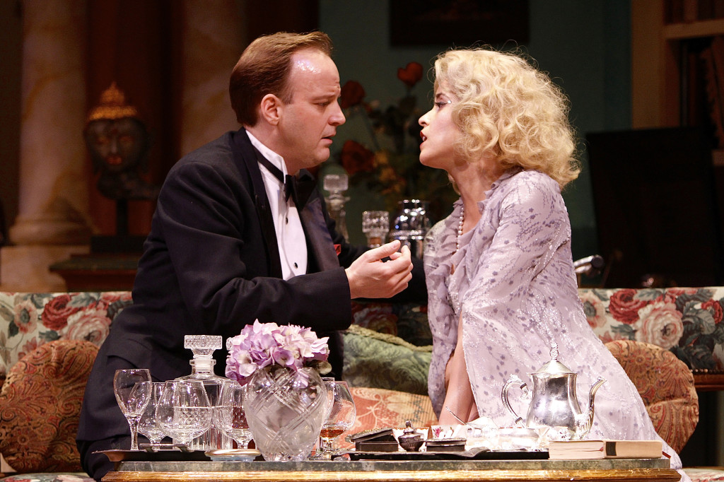 Coward’s literary creation of Madame Arcati is also one for the ages, as well as a feast for the lucky actress who snags the coveted role. Patricia Hodges is an endearing Arcati, able to plow through the dialogue devoted to astral planes and ectoplasmic mumbo-jumbo with a plucky charm (before a séance she sings “Heigh ho, to work I go,” a reference to Disney’s Snow White and the Seven Dwarfs) and yet managing to be mock-serious when occultist Arcati notes the timbre of an angry cuckoo in the garden. Director Michael Barakiva also grabs huge laughs with the running sight gags that take place after each séance, with Hodges’ Arcati usually sprawled out on the floor.