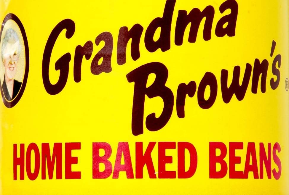 Grandma Brown's Baked Beans cans have an old-fashioned logo, with brown and red text on a yellow background, with a picture of Grandma Brown and a casserole dish of beans.