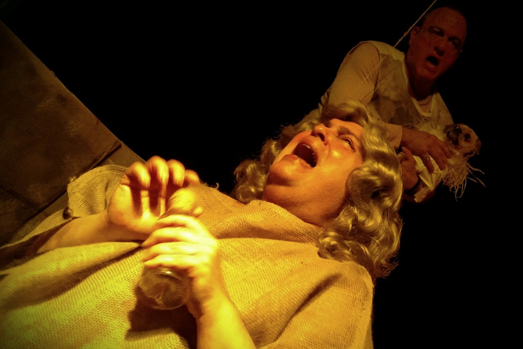 Tursi’s casting of the experienced Shakespearean performer Hill, not a Rarely Done regular, might have been his wisest guarantor of hilarity in Clams. Possessor of an orotund baritone, Hill is a more stentorian figure than Anthony Hopkins was in the movie. No one is going to challenge Hopkins’ winning his Oscar, but he has a tendency to get twinkly. Hill, on the other hand, is the pluperfect straight man in this gay-friendly production.