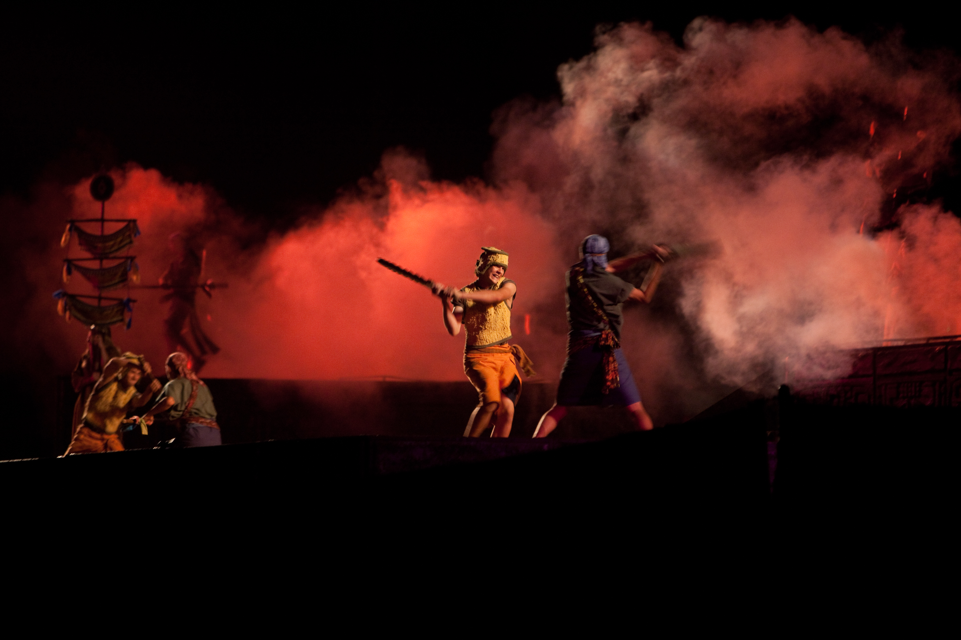 Backstage, cast members in period costumes were outfitted with wigs and beards. Others put finishing touches on handmade props or practiced the dance and fighting routines they’d learned during the 12-hour daily rehearsals they’d attended since arriving last weekend in Central New York. Nearby, the 28-man work crew was harnessed and rigged to ascend the 12 light towers that framed the stage.