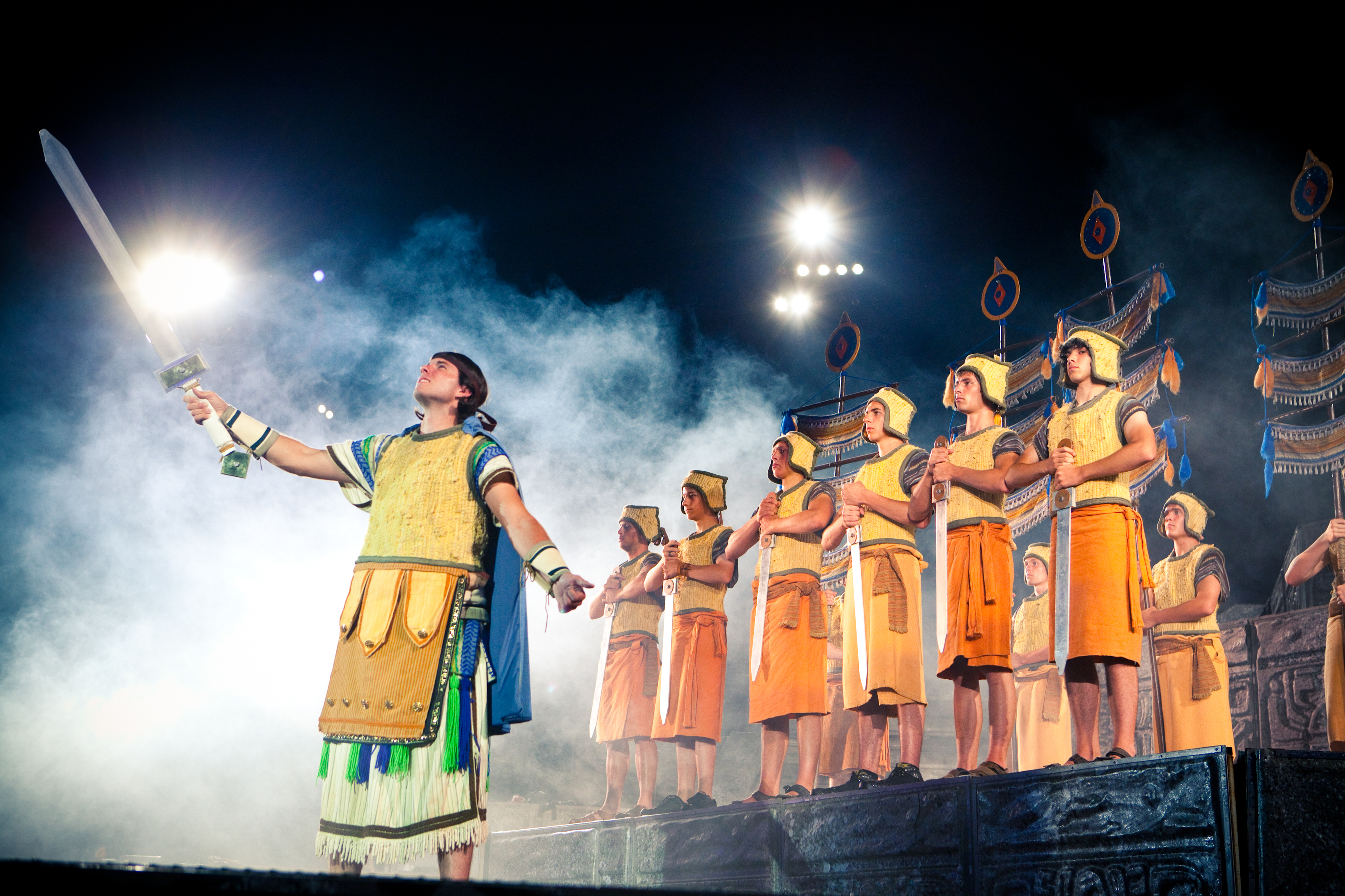 Shortly after 9 p.m., the crowd began to settle, and the cast members found their marks. The play, officially titled America’s Witness for Christ, begins 600 years before the birth of Jesus, when the Prophet Lehi tells the people of Jerusalem that they must repent or their city will be destroyed. Based on the Book of Mormon, the story tells of the cycles of corruption and redemption that Lehi’s descendants endured from A.D. 471 through the early 19th century.