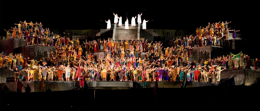 Though the story is problematic at best, the production is something to be seen. The effect of an enormous cast pantomiming to a recorded script, underscored by a recording of the Mormon Tabernacle Choir and the Utah Symphony, is further accented by pyrotechnics and water effects. If you can set the dubious content aside, it’s easy to be taken in by the drama of it all.