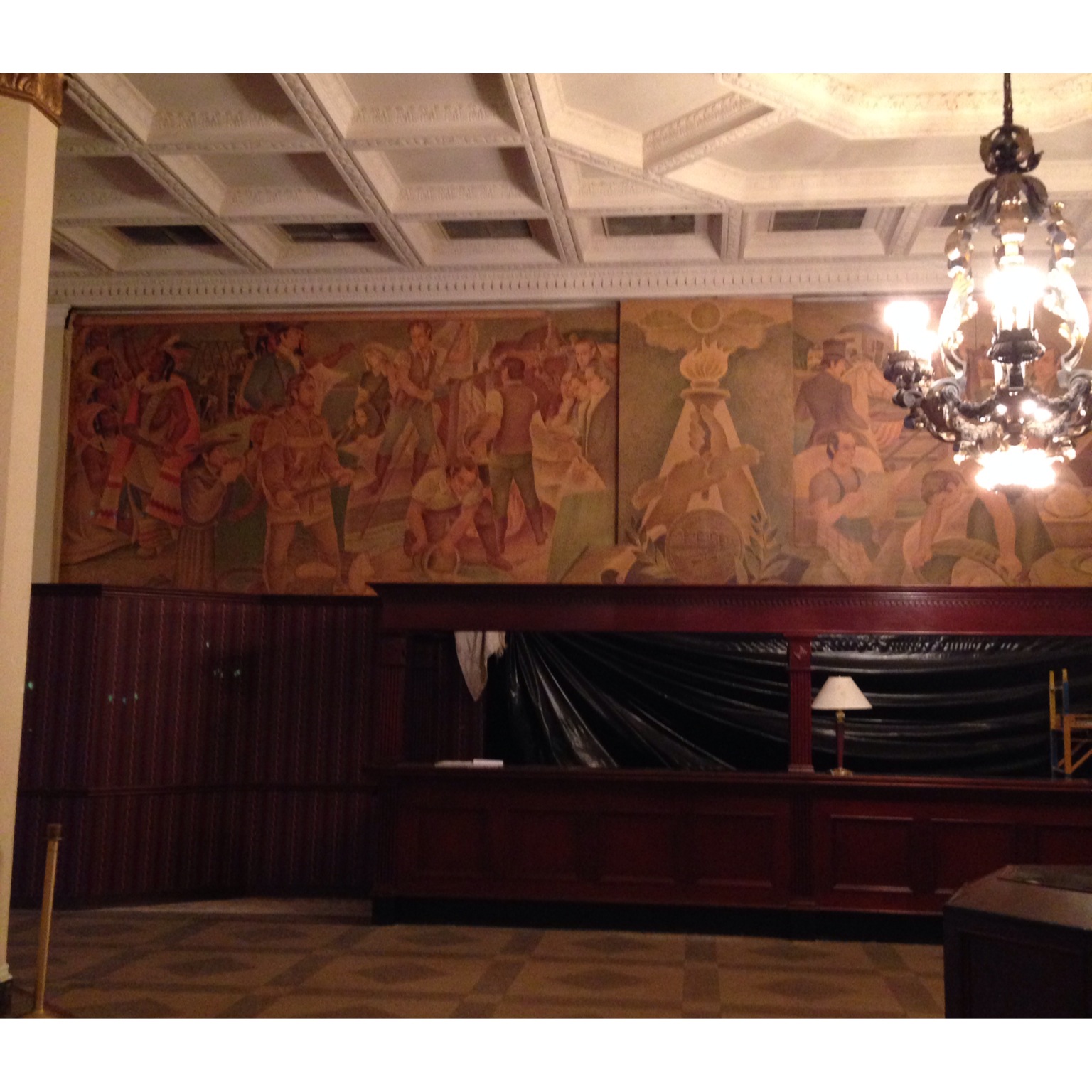 Speaking of the lobby – it has an open setup and jaw dropping beauty. The windows, which currently are blocked by boards, will be opened to allow natural light to flow in. Over the top of the front desk, the 40-foot by 10-foot mural, painted by Carl Roters, will once again depict aspects of Syracuse’s national history to guests.