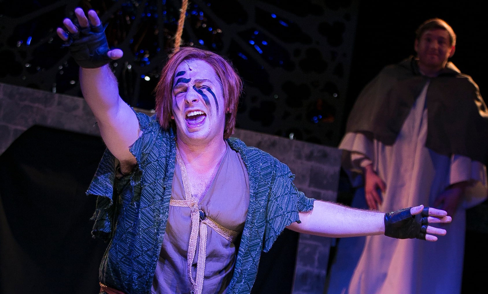Years pass. A previously unnoticed male actor emerges from the pack to call out, “What makes a monster, and what makes a man?” He uses his fingers to paint a series of lines on his face, signaling deformity, and straps on a prosthetic “hunch” before jumping to swing a knotted rope implying a bell pull. What an entrance for the title character, played by Liam Fitzpatrick. Searor’s note identifies the man-monster quote as the central theme of the complex action.