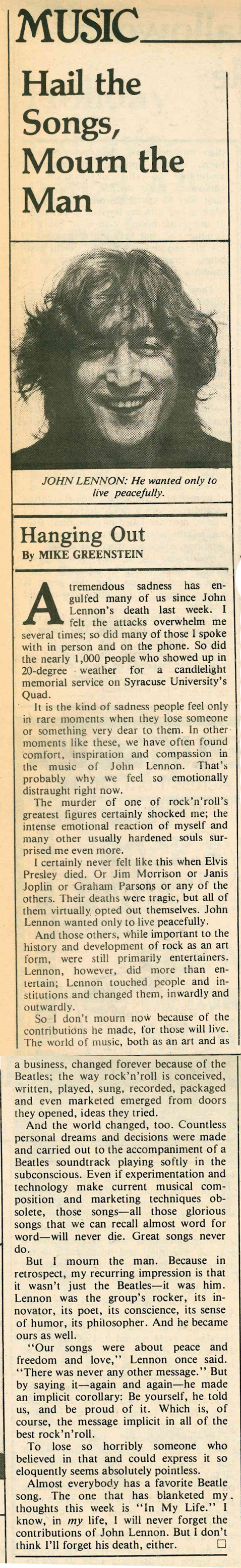 Two days later, Syracuse New Times writer David Sokol remembered Lennon in an article titled “A Dream is Over, ” digitally reproduced below.