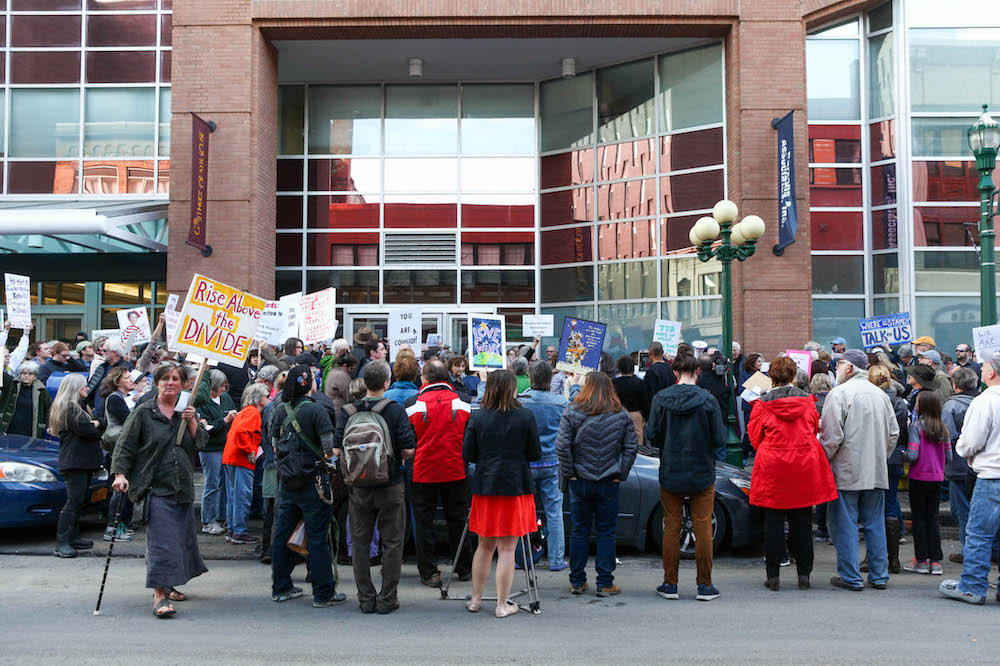On Monday, Feb. 27, Katko appeared in a 32-minute Facebook Live interview with the Auburn Citizen. Critics say this format, like those of his other events, allows Katko to control the narrative, avoid facing opponents and stifle debate. Monday’s online interview drew many of the same questions protesters raised during a Feb. 22 two-hour march and rally in Syracuse.