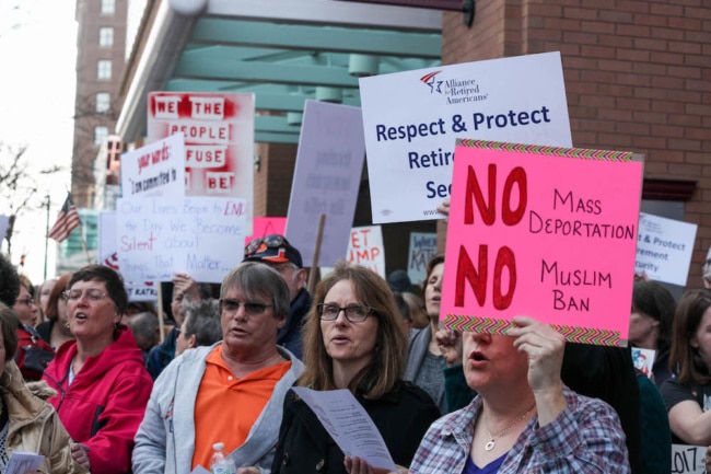 Kristin Mosher of Syracuse finds Katko’s comments about protesters insulting and dismissive. “They want to silence us,” she said. “It makes me want to sit down so he can hear what we’re concerned about. If he can’t, we’ll elect someone who supports human dignity, because this administration isn’t.”