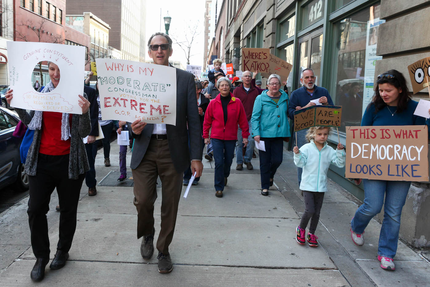 About 400 people participated in the Feb. 22 Syracuse rally, asking, “Where is Katko?” Simultaneous rallies took place in Auburn, Lyons and Oswego. The rally started and ended at 440 S. Warren St., home to Katko’s Syracuse district office. On an unseasonably warm day, protesters — many of whom identified themselves as first-time participants — marched and chanted for nearly two hours.