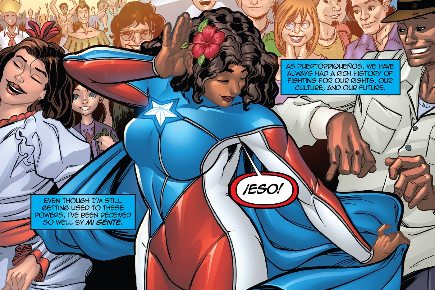 When it came time to write the story, Miranda-Rodriguez first designed his heroine’s costume. The red, white and blue body-fitting suit pays homage to the country’s flag, including the one bright white star, which sits below the right shoulder.