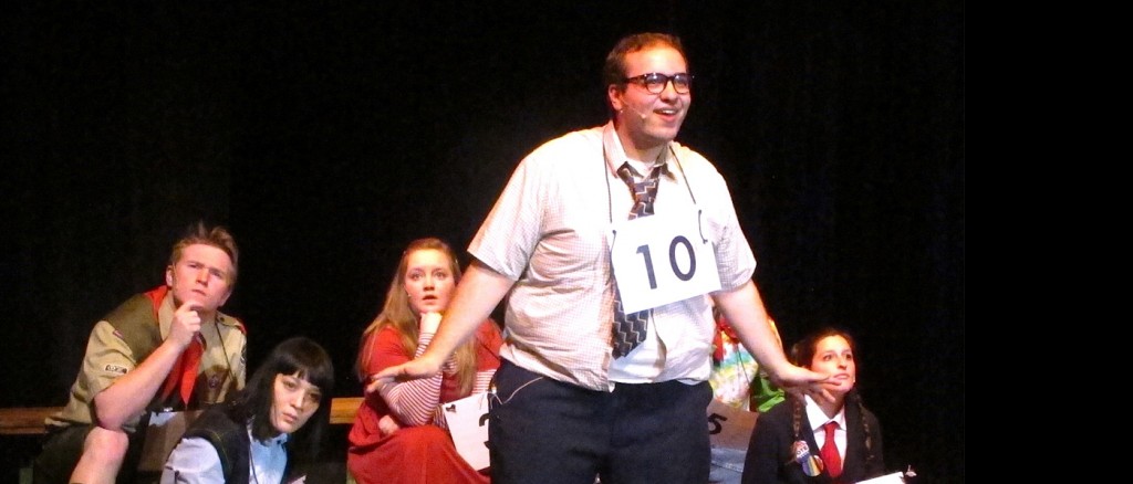Also hard to cast with undergraduates are the three adults who are on stage all the time, as well as delivering musical numbers. Jenna Seifert as Rona Lisa Peretti is a long-ago winner, for syzygy (she keeps spelling it now), who has morphed into a self-promoting real estate salesperson. She remains detached while delivering excruciating put-downs of the kids. As vice principal Panch, a man trying to recover his career after disgrace and suspension, Jim Maxwell has to have the kind of timing that can get laughs from the useless definitions given the kids, like “Don’t use Jewish phylacteries because we’re Episcopalian.” And as ex-con Mitch Mahoney, burly Chris Lupia makes the most threatening comforter ever seen. He’s like a tattooed biker from Duck Dynasty.