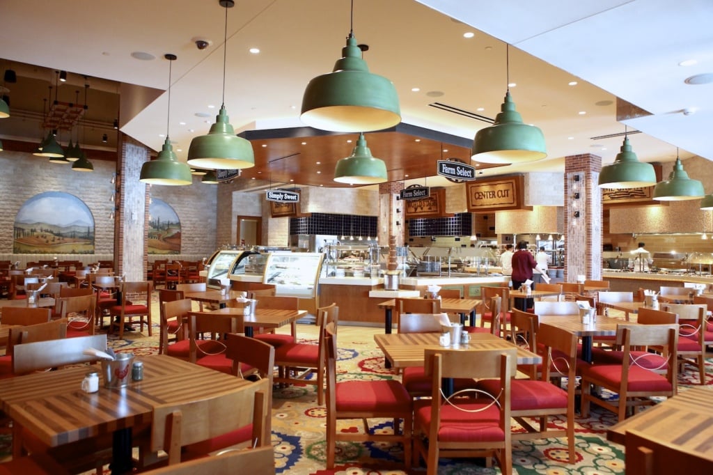 The brightly lit buffet area currently seats 299, with a mix of tables and booths that surround the food stations. Those areas boast names such as “Stir Crazy” (a nod to the stir-fry menu) and “Center Cut” (devoted to meaty specialties and a carving station).