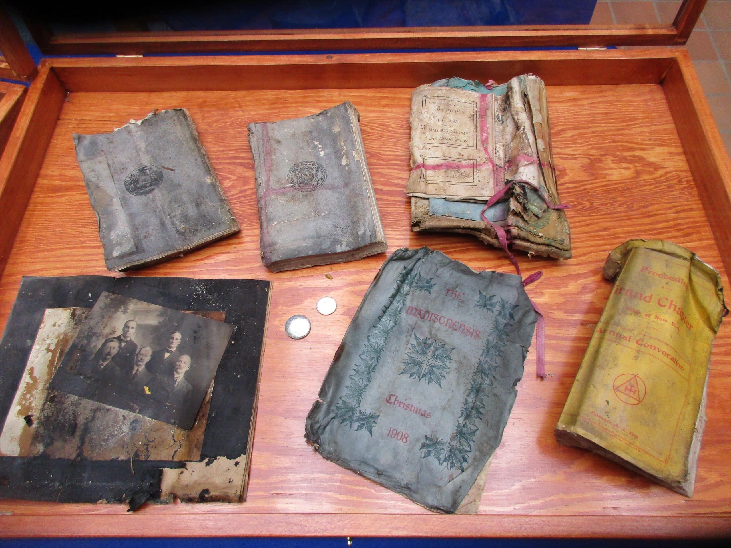 Some of the documents on display following the April 16 opening of a 1909 time capsule at the Madison County Courthouse. (Michael Davis/Syracuse New Times)