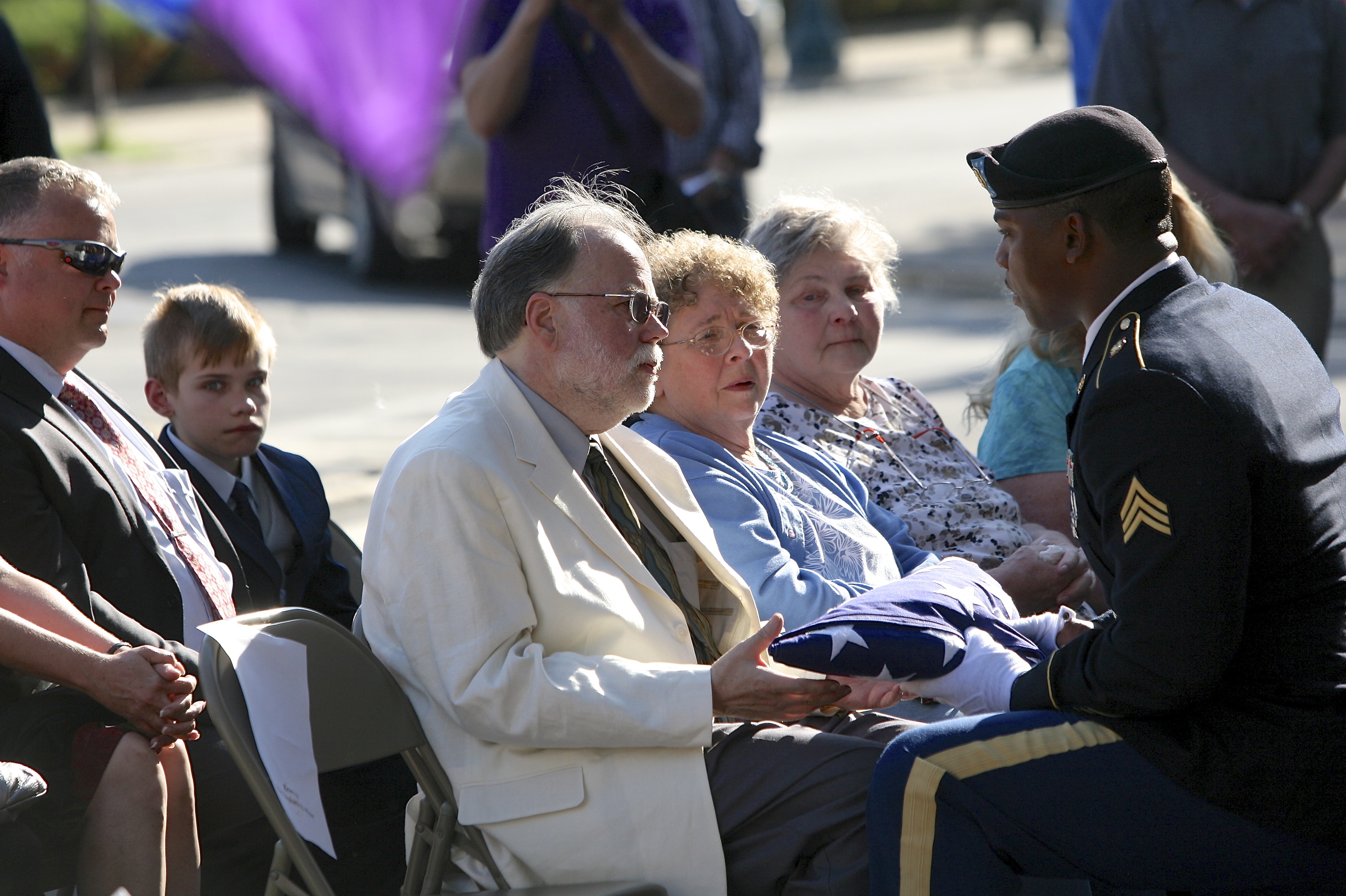 Local actress and singer Patricia Catchouney lended her voice in opening the celebration with “I’ll Be Seeing You” and closing with Colvin’s favorite song “Somewhere Over the Rainbow,” as the rainbow flag was raised in his honor. A manager of movie theaters in the 1950s, Colvin was also a Korean War combat veteran, a singer, actor and printer. He owned and operated The Printer’s Devil with his partner Joel for many years on the city’s north side, as well as Theatre a la Carte, a community theater in the 80s and 90s.