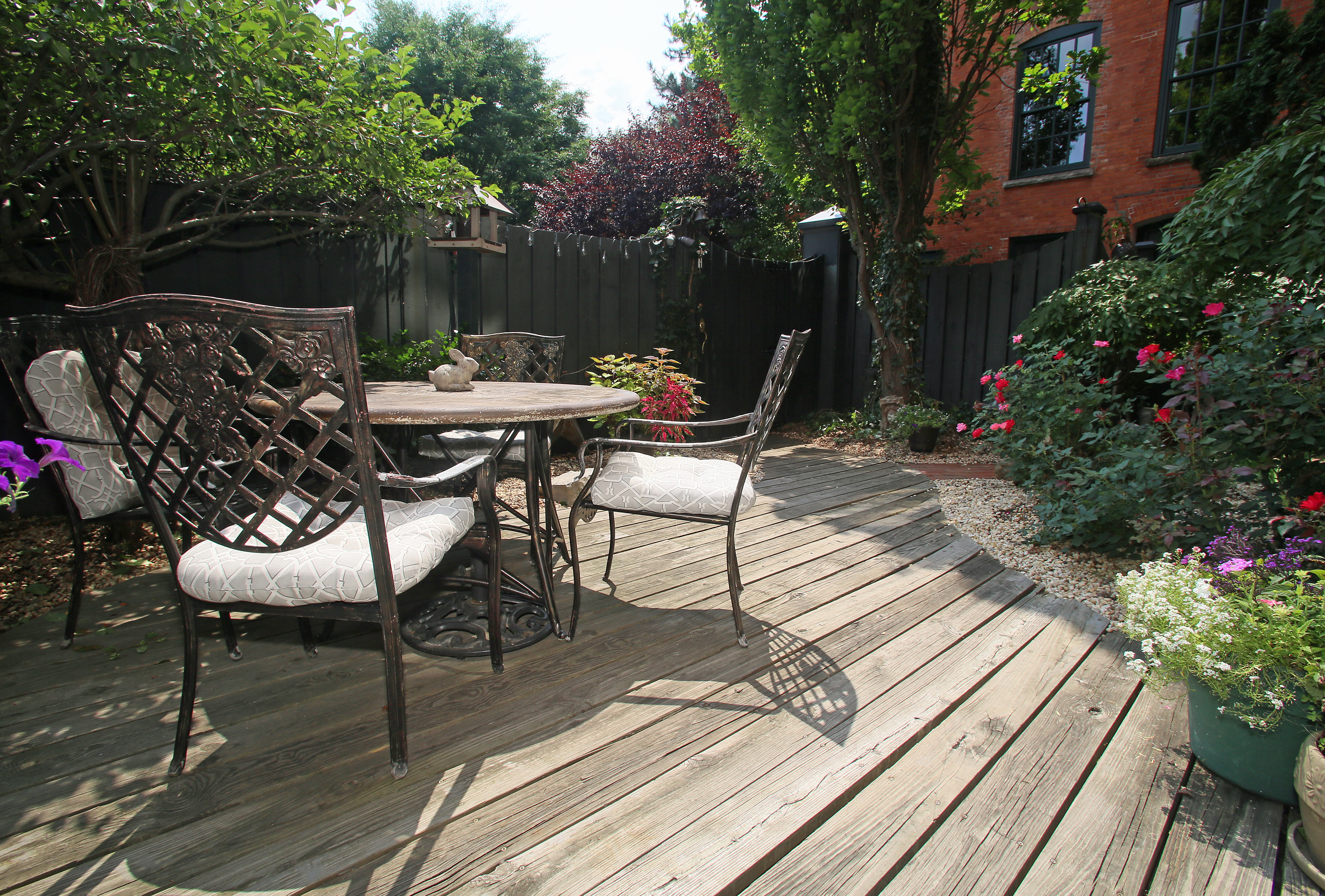 The previous owner had both outdoor spaces professionally landscaped. She left behind the patio furniture and the garden decorations. Both spaces are fenced, giving the couple’s Great Dane puppy, Scarlett,a place to roam.