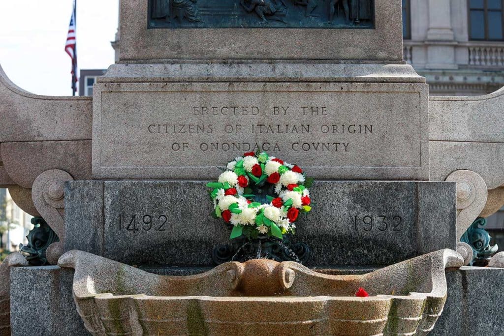 Syracuse Mayor Rowland Marvin’s 10-year-old daughter, Irene, “pulled the silk cords which threw aside the covering of the statue,” an 11-foot, 3,000-pound bronze likeness of Christopher Columbus, sculpted by V. Renzo Baldi, of Florence, Italy. The monument, designed by renowned architect Dwight James Baum, was the culmination of a 25-year campaign among local Italian-Americans seeking to highlight their ethnic pride and patriotism with a memorial to the Italian navigator who sailed to the Americas on behalf of Spain in 1492.