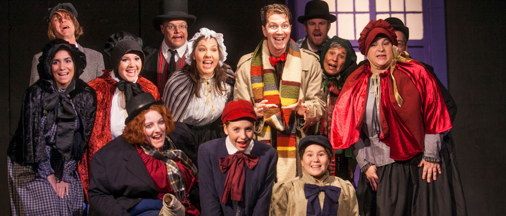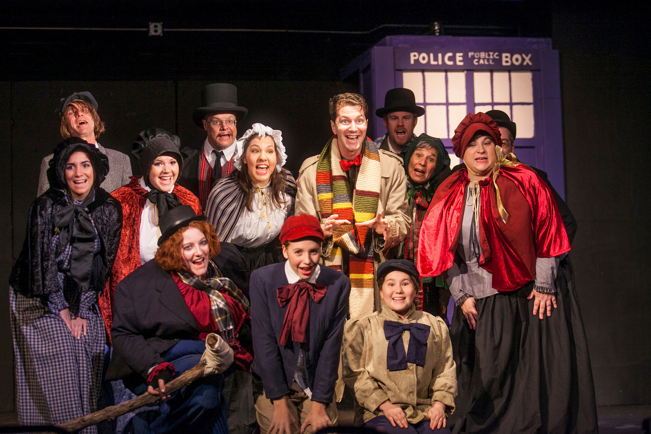 The show starts as a spoof of Charles Dickens’s A Christmas Carol, seen through the eyes of the usually unappreciated wife–here given the name Gladys (JoAnne Rougeux)–of Scrooge’s long-suffering clerk Bob (Matthew Green). Fed up with poverty and a house filled with kids (up from Dickens to 21), Gladys is driven to drink, thus the “binge” of the title. Boozed up, she wanders to the River Thames and contemplates jumping in, asserting that it would have been better if she was never born. This is like, ahem, It’s A Wonderful Life’s George Bailey (played by John Kenrich), who is in the show as well as the husband and wife from O. Henry’s Gift of the Magi plus characters from other Dickens novels and ongoing references to the British TV series Doctor Who.