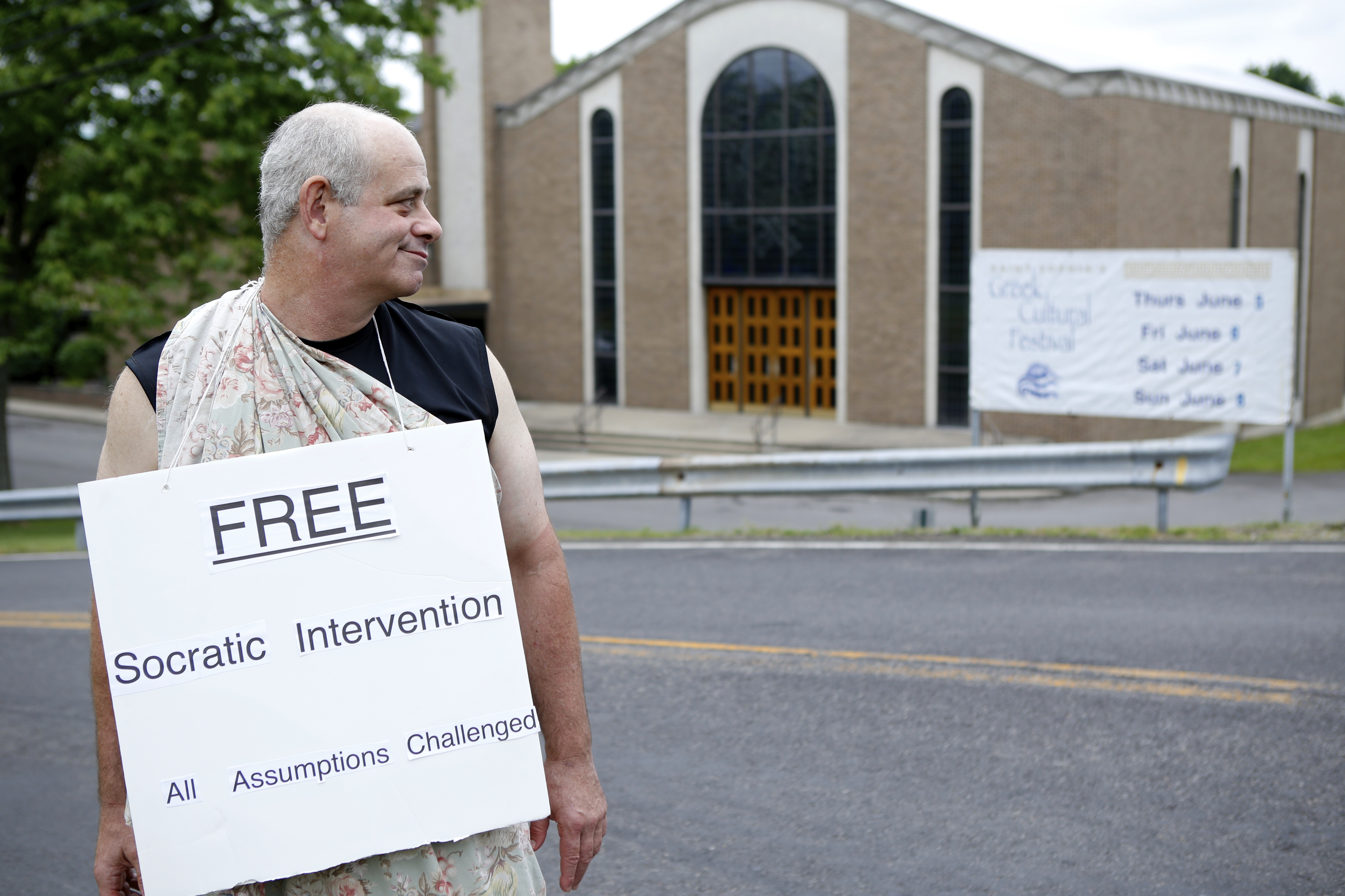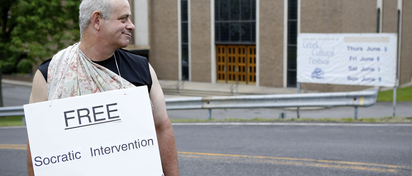 My objective was innocent enough. At a festival that overlooks the contributions of the ancient philosophers in favor of traditional Greek food, beer and dancing, I merely sought to offer Socratic-style engagement to the masses. I donned an ancient Grecian-style robe and hung from my neck a poster that read: “Free Socratic Interventions. All Assumptions Challenged Here.”