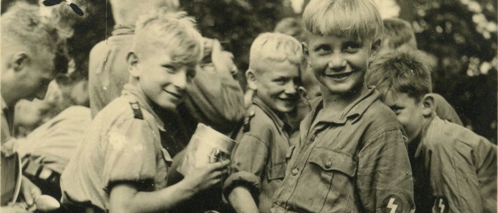 The images often come from family albums and portray scenes at home: a mother looking on as her son tries on a Nazi uniform that’s far too large for him; a man dressed in Nazi clothing and his wife with a toddler holding a stuffed dog; a family of seven captured in a portrait.