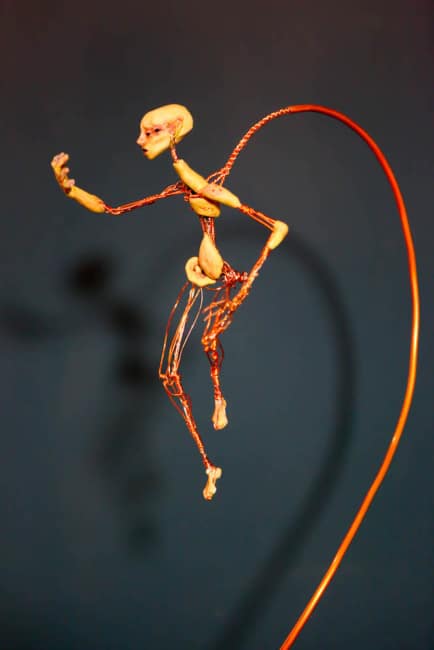And the show has artworks not easily characterized. Ben Coupe’s collage “Moon Rock” situates a finger-snapping Elvis Presley performing for an extraterrestrial audience on the moon. A small alien at the end of a wire is the centerpiece of Glendon Allen’s mixed-media assembly, which extends from a pedestal on the floor up the wire. Charlie Sam’s acrylic and enamel on canvas, “Space Robot,” integrates multiple small shapes: snakes, clocks, a skull, stars, and yes, a robot.