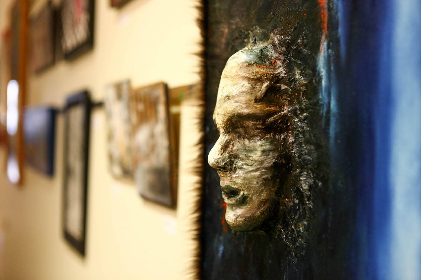There are pieces referencing the cosmos. Paula Brewer’s mixed-media work portraying planets and space is situated on top of a coffee table. “Seer Between Worlds,” by Prudence Haze, envisions a mystical journey.