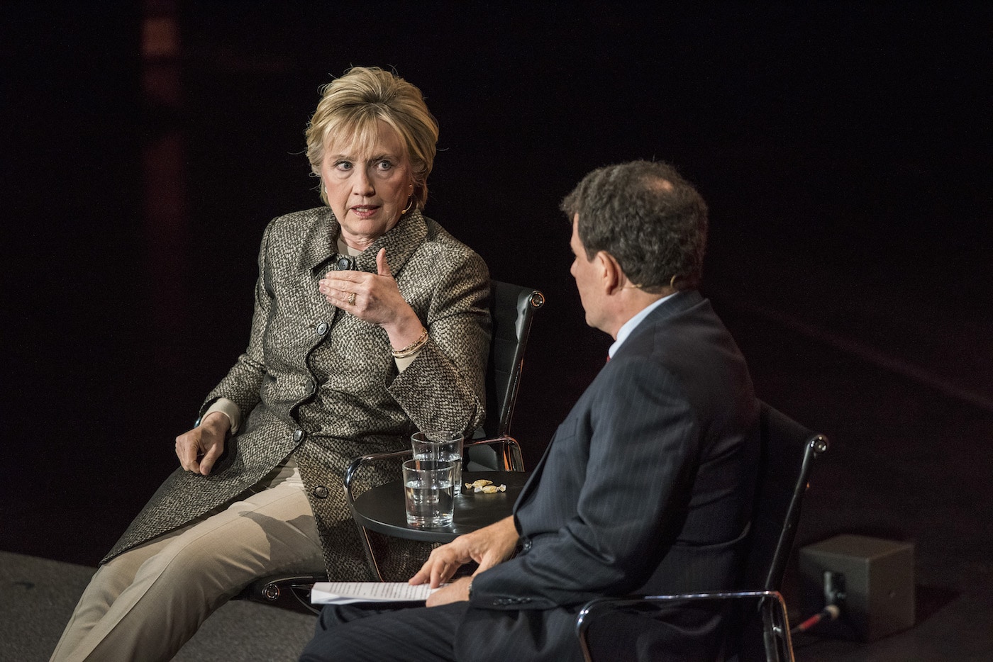 Hillary Clinton is interviewed by Nicholas Kristof at the Women in the World conference in the David H. Koch Theater at Lincoln Center in New York, April 6, 2017. In her first interview since the election, Clinton spoke about candidly and freely about her defeat and the new presidency. (Stephanie Berger/The New York Times)