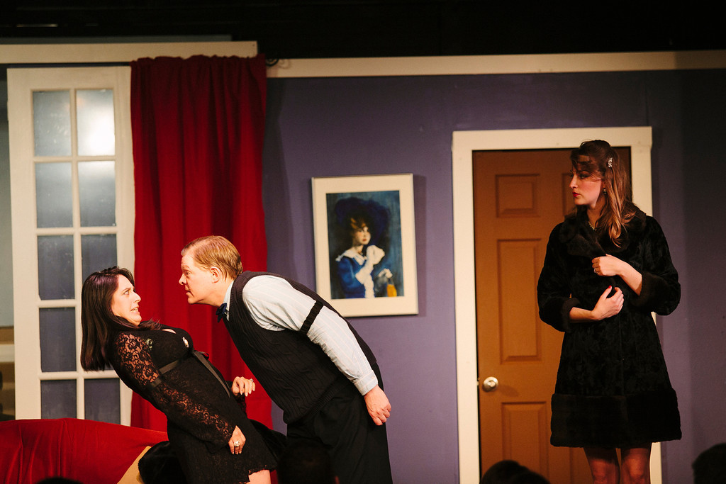We don’t expect realism from farces, but this production enjoys two assets. One is that all the furs look terrific. No credit is given in the program, so we have to assume that the troupe has some generous friends. Secondly, director Dustin Czarny has ensured that players stick to British accents all the way through, but not everybody comes from the same neighborhood. Spunky, no-nonsense administrative assistant Miss Tippdale (Binaifer Dabu), for example, sounds as though she might have gone to school with the Geico gecko. In the Upstairs,Downstairs milieu of British drama, Miss Tippdale’s accent means she’s faster on the pickup than the two male dunces she works for.