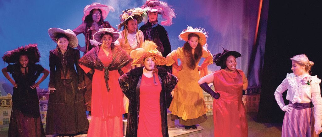 Despite several community theater gigs, Tamar Smithers is a tad young to portray Mayor Shinn’s fatuous, culture-loving wife Eulalie Mackechnie, but her musical chops serve her well in the appropriately bombastic “Columbia, Gem of the Ocean.” She and her clucking Pick-a-Little Ladies, led by Hillary Taylor, Mary Nickson and Elaine Koh, are well-costumed by Nikki Delholmme.