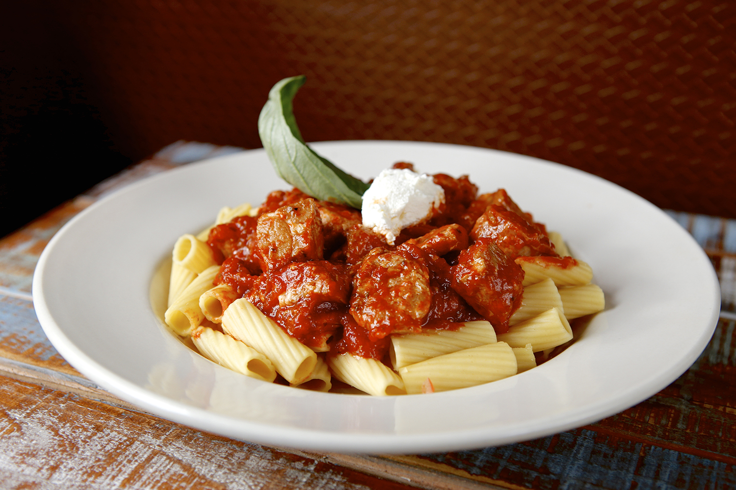Pascal's Italian Bistro -Sunday Gravy (House Specialty) Rigatoni with Braised Pork & Sausage with San Marzano Plum Tomatoes, Garnished with Fresh Ricotta Cheese. Michael Davis Photo