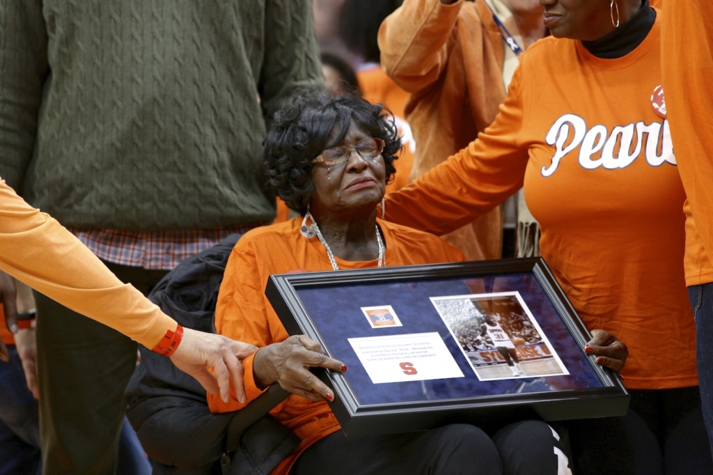 Video tributes to Washington played throughout the game, and the halftime ceremony featured many of Pearl’s former teammates presenting each member of Washington’s family with a framed photo of Pearl that also included a piece of Jim Boeheim Court.