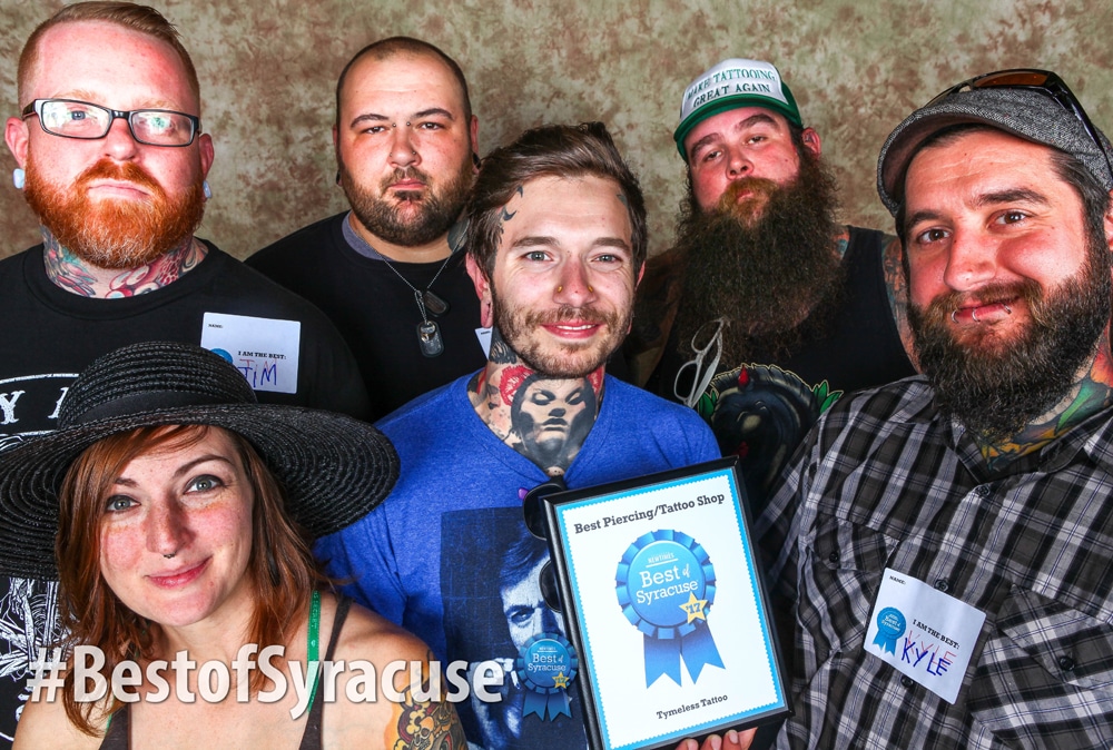 Best Piercing/Tattoo Shop: Tymeless Tattoo – Front row, Jamie Santos, James Coldiron, Kyle Proia. Back row, Jim Sidelinger, Shane Trivett, Todd Yoder.