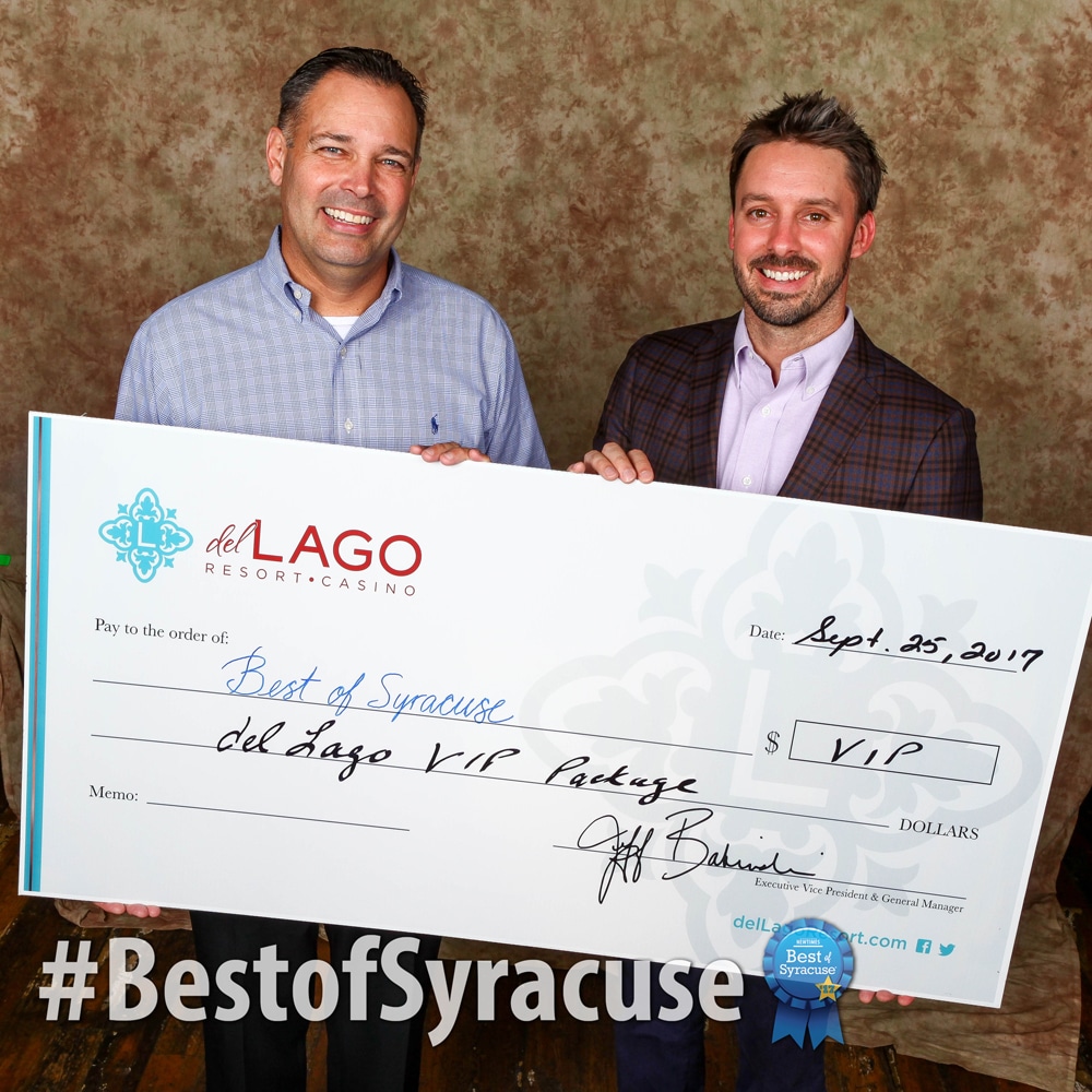 Best of Syracuse check: Mike Lombardo (winner), Jason Klug, director of entertainment at del Lago Resort and Casino.