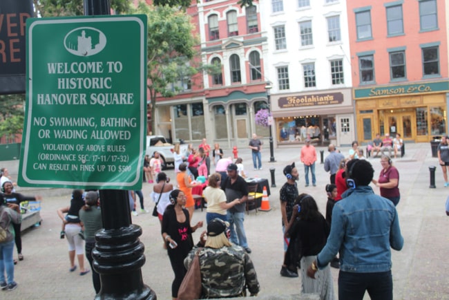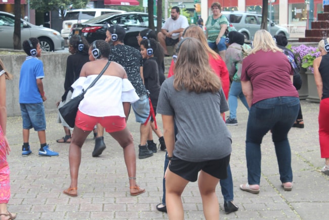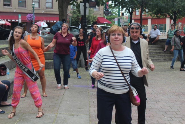 Dance fever hit downtown Aug. 17 when the Silent Disco took over Hanover Square. The goal of the free event, sponsored by the Syracuse chapter of the American Heart Association’s Go Red For Women campaign, was to raise awareness about heart disease and to get people in shape. Headphone-wearing hoofers took to the pavement while listening to dance-floor fillers such as “Billie Jean” and “Uptown Funk,” as they sang along with the lyrics filling their noggins.