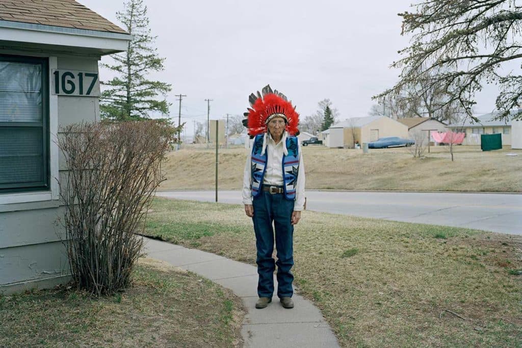British photographer Kalpesh Lathigra came to South Dakota to revisit the site of the Wounded Knee Massacre. His image depicts Vincent Brings Plenty, an indigenous elder, standing near a housing development.