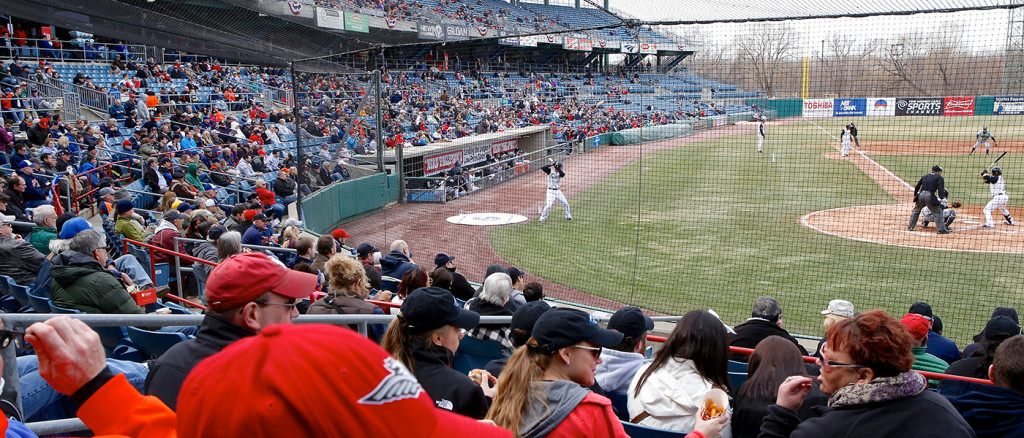 More than 6,500 fans attended the Syracuse Chiefs’ opening day, a 4-1 loss to the Scranton/Wilkes-Barre RailRiders. Some found it inspiring, with the stadium dressed up in bunting and, hey, baseball back in town. Others — notably members of the Simone family, the team’s former management — found it … uninspiring. Members of the family registered complaints on social media about a range of issues, including the movement of a bust of Tex Simone, a long-time Chiefs executive, from the walkway in the stands (above) to the Hank Sauer room, at the end of the first-base line.