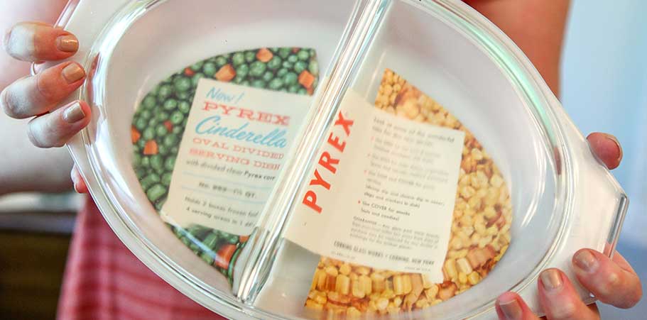 Bowls, baking dishes, square, round and oval casseroles, fridge dishes, chip and dip sets: Neidl has them all. She’s especially fond of Pyrex bowls with handles that double as spouts. “They’re great for mixing and pouring,” she says. Neidl’s not sure how to best make use of divided dishes, but she has a few of those, too.