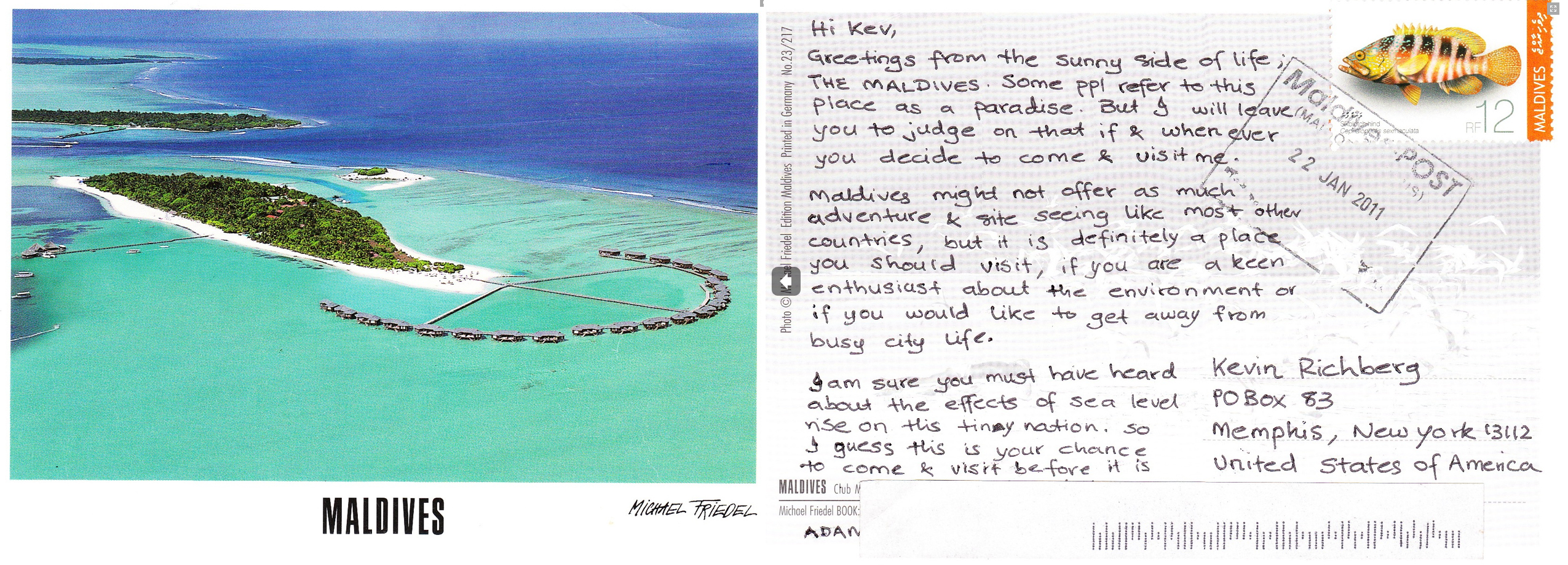 The postcard said, in short: “I am sure you must have heard about the effects of the sea level on this tiny nation, so I guess this is your chance to come and visit before it is…” (the postage barcode covers the rest, but you get the idea).