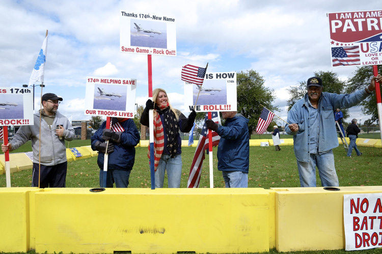 Bonny Mahoney stood perched atop a ladder in a blue jumpsuit with a handmade “drone spotter” sign on the back. She peered through a pair of binoculars, looking toward Hancock Field Air National Guard Base. Suddenly, with a buzz growing louder in the background, she shouted, “The drones are coming!”
