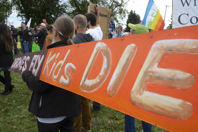 The protest Oct. 5 brought about 50 supporters to the lawn in front of the base. They held signs and waved banners with phrases like “Drones fly, children die,” “Drones make killing easy” and “Fly kites, not drones.”