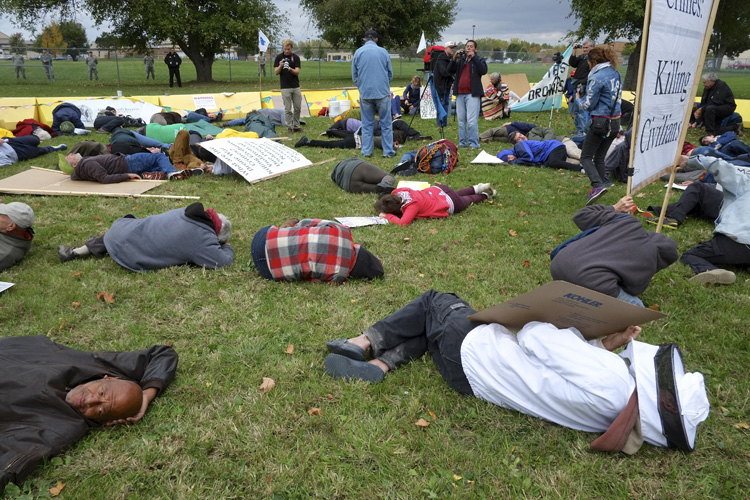 Then, about 50 people standing in a yellow protest pen in front of the base fell to the ground. They moaned and writhed, until they fell still on the grass, their clothes speckled with dots from the beginnings of a light rain.